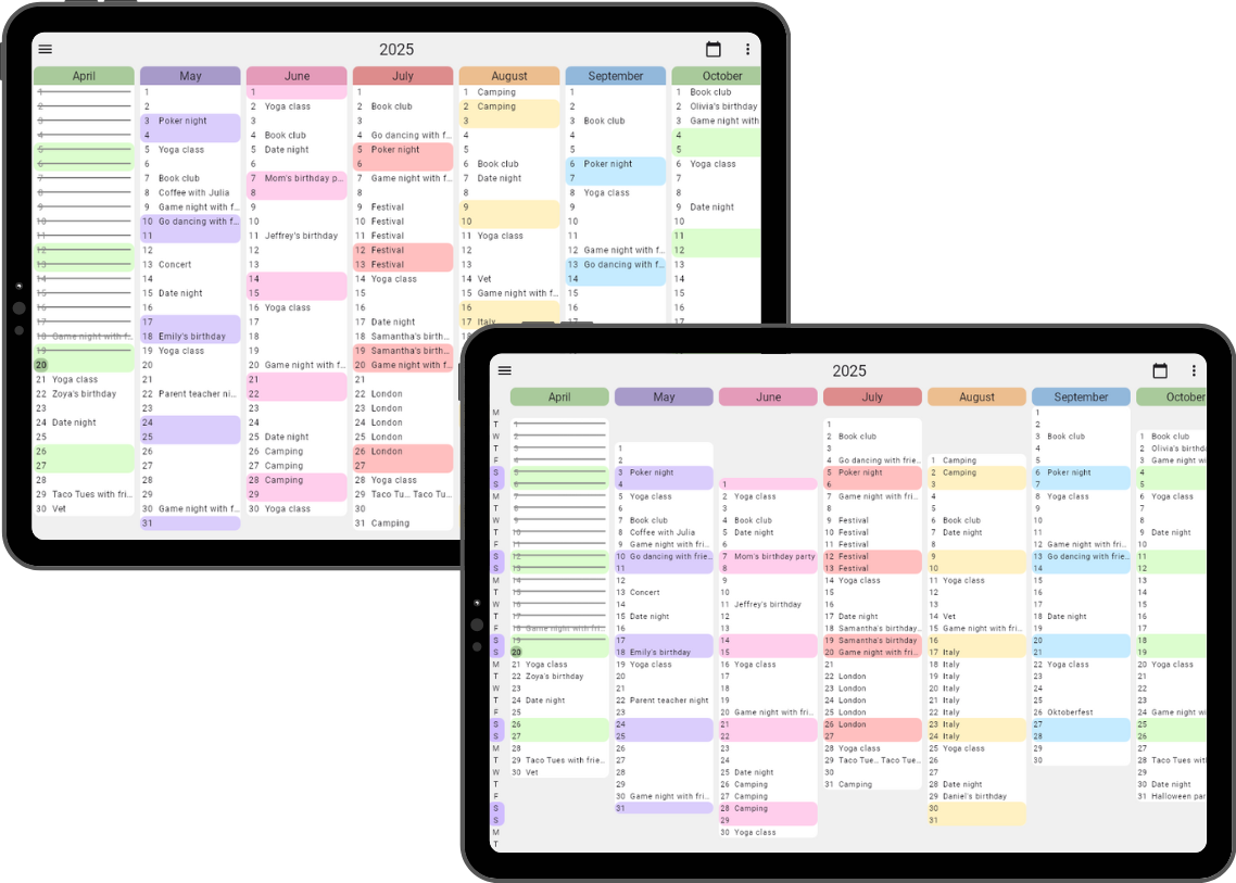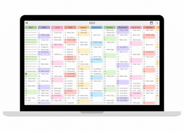 In the default view, each month is a vertical column, letting you visualize time like never before. Align days by date (starting from day 1 at the top across months), or align weekends to focus on planning your free time and clearly seeing months with fewer weekends. You can also adjust the width of the columns to zoom in on only viewing a couple of months at a time, or zoom out to see your full year.
